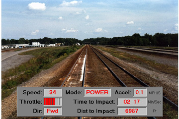 A train headed by two General Electric 8-B40 locomotives approaches a grade crossing. Overlaid on the animation is a computer-generated "dashboard" showing up-to-the-second data from the locomotive's event recorder.